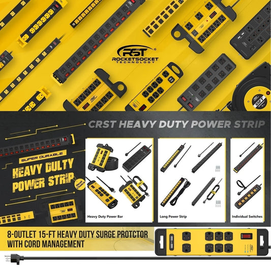 Surge Protector Power Strip with Dual USB Port 3.4A Metal Heavy Duty 8 Outlets 15FT Long Extension Cord 1960J with Management for Garage, Workshop, Industrial and Commercial, ETL Listed